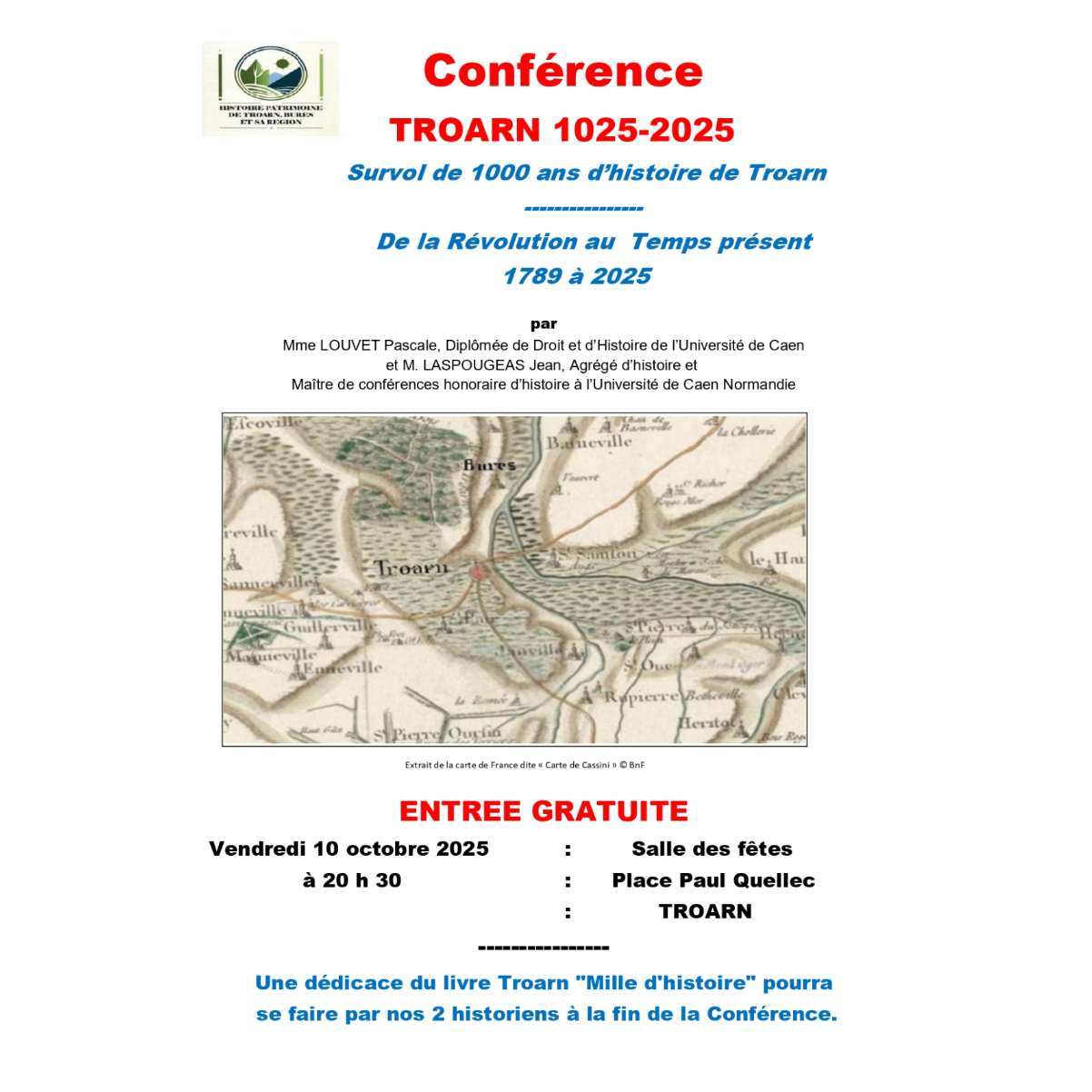 À l’issue de la conférence, une dédicace du livre “Troarn, mille d’histoire” sera proposée par les auteurs.