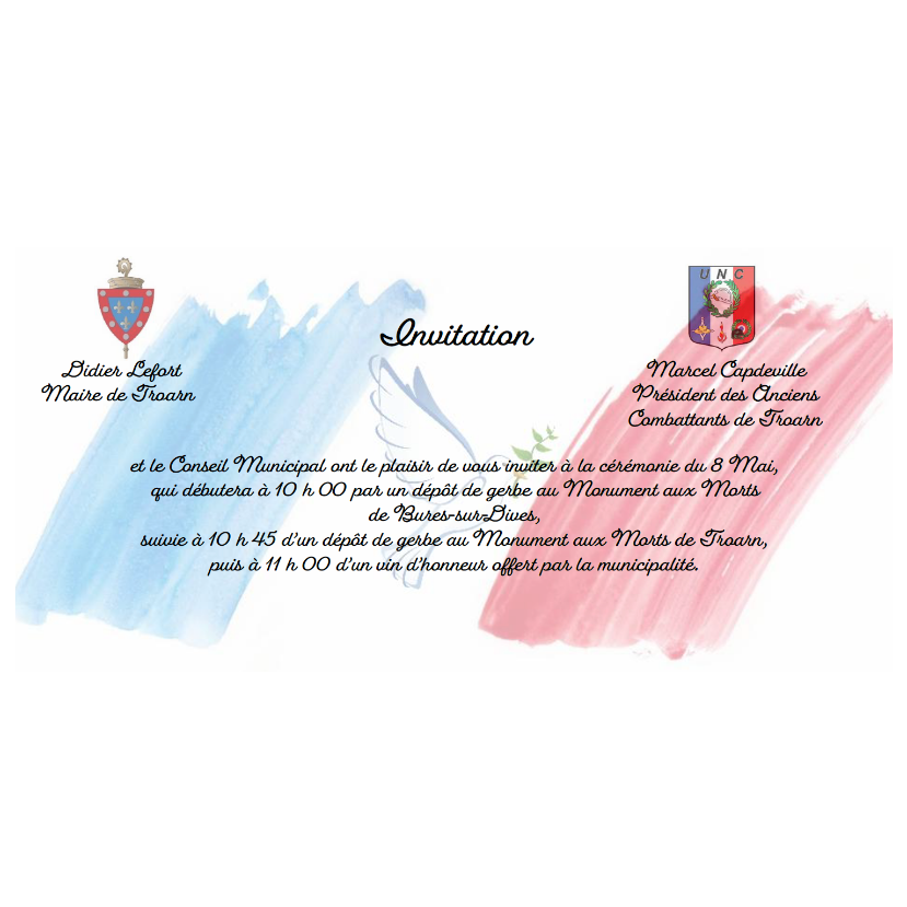 Monsieur le Maire et le Conseil municipal, en présence du Président des Anciens Combattants, vous invitent à participer à la cérémonie du 8 mai.