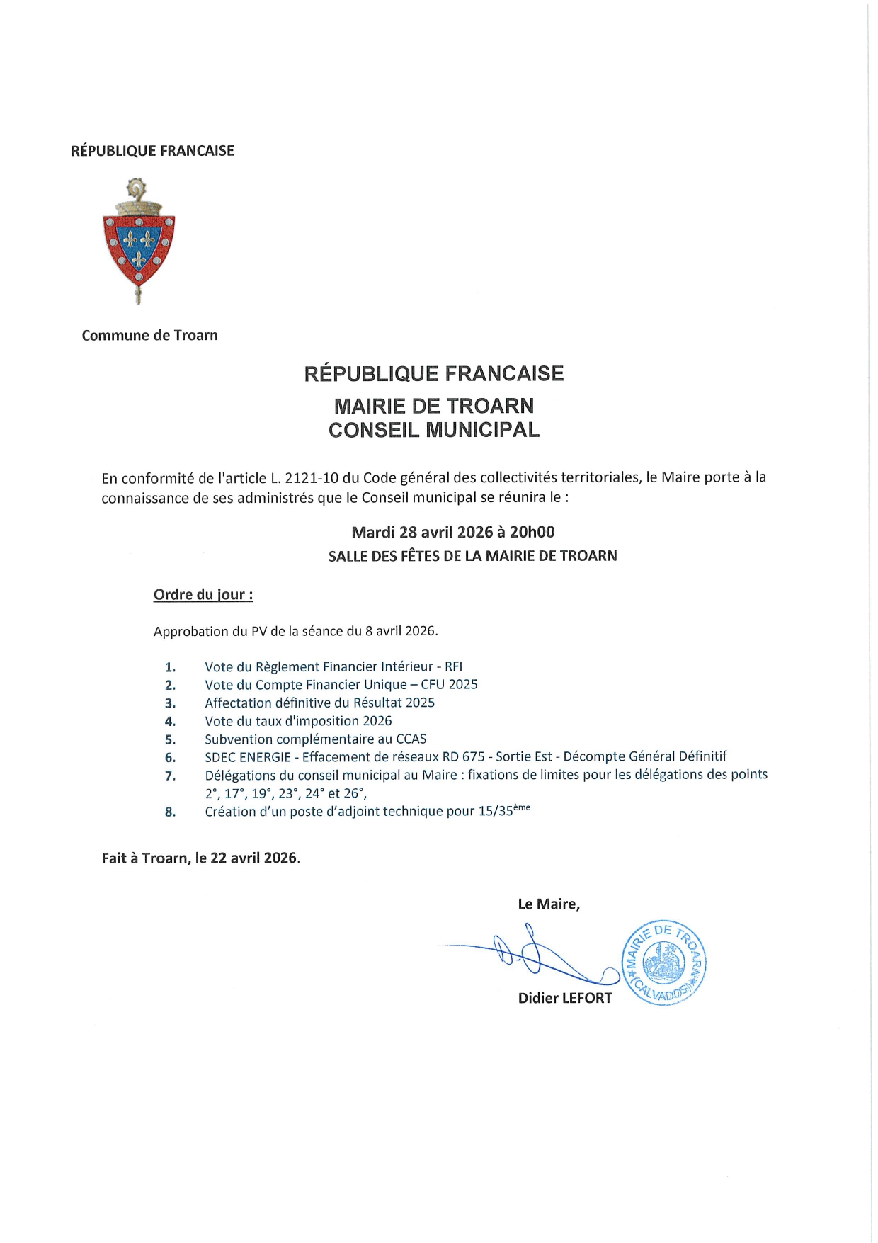 Date : Mardi 28 avril 2026 à 20h📍 Lieu : Salle des fêtes de la Mairie de Troarn